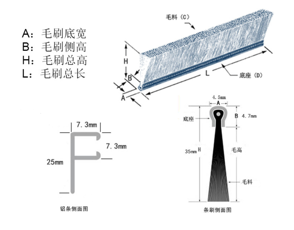 工業(yè)門(mén)、卷簾門(mén)、快速門(mén)一般使用H型(180°)或者F型(90°)鋁條配套毛刷,毛刷的高度常用規(guī)格是35mm,50mm,100mm,毛料有PP,PA。
